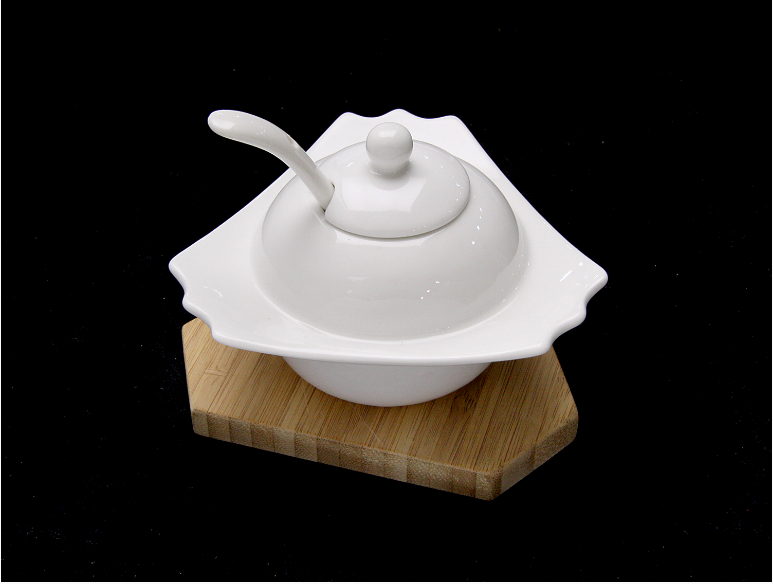 Bambu tepsili, kapaklı tekli şekerlik. Beyaz renkli porselenden imal edilmiştir.