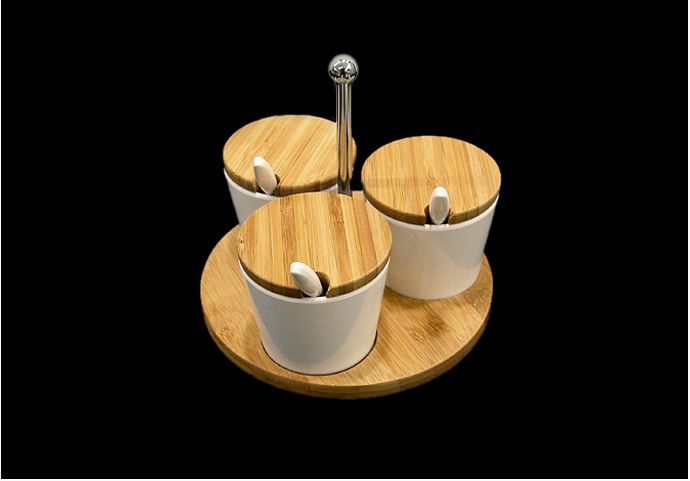 Bambu Tepsili ve kapaklı 3'lü Reçellik Seti. Beyaz Renkli sıkıştırlmış plastikten imal edilmiştir.